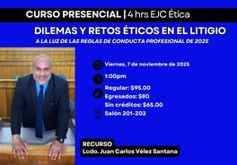 Este curso examina los retos y dilemas éticos en la prática del litigio en Puerto Rico, a la luz de las Reglas de Conducta Profesional de 2025. Se analizarán situaciones y dilemas éticos que se enfrentan en el proceso litigioso.